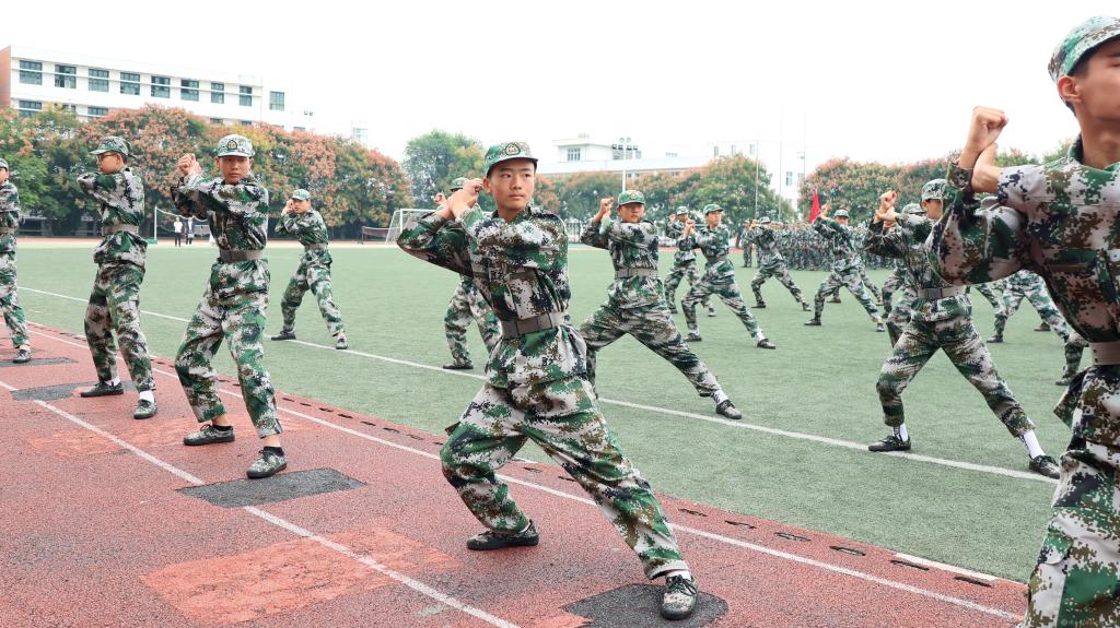 在奏唱《中华人民共和国国歌》后,参训学生汇报展示军训成果。嘹亮的口号、整齐的步伐、宏伟的军歌、威武雄壮的军体拳和擒敌拳,充分展现了机电学子刻苦训练的成果和奋发向上的精神风貌。