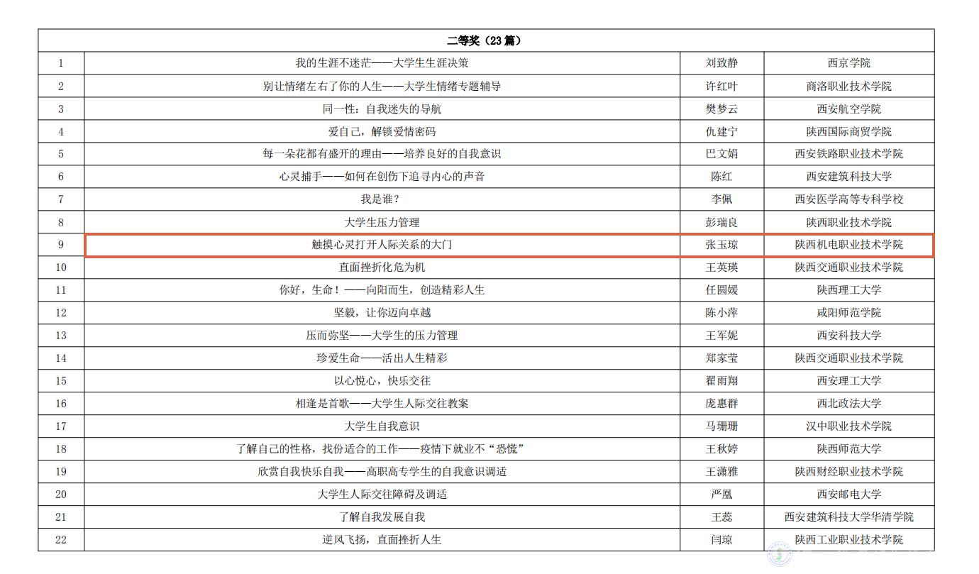 陕西机电职业技术学院参加陕西省委教育工委举办的第五届“阳光护航”心理育人宣传季实践系列活动,在第二届心理健康教育优秀教案评选活动中我校教师张玉琼所作题目为《触摸心灵打开人际关系的大门》的教案获得了二等奖、张军霞所作题目为《控制情绪做情绪的管理者》的教案获得了三等奖。