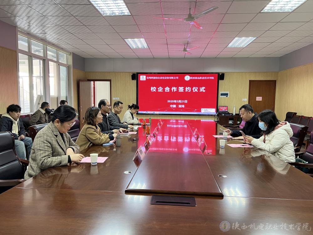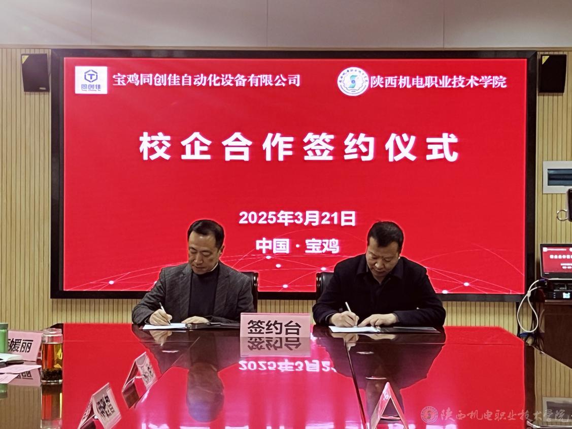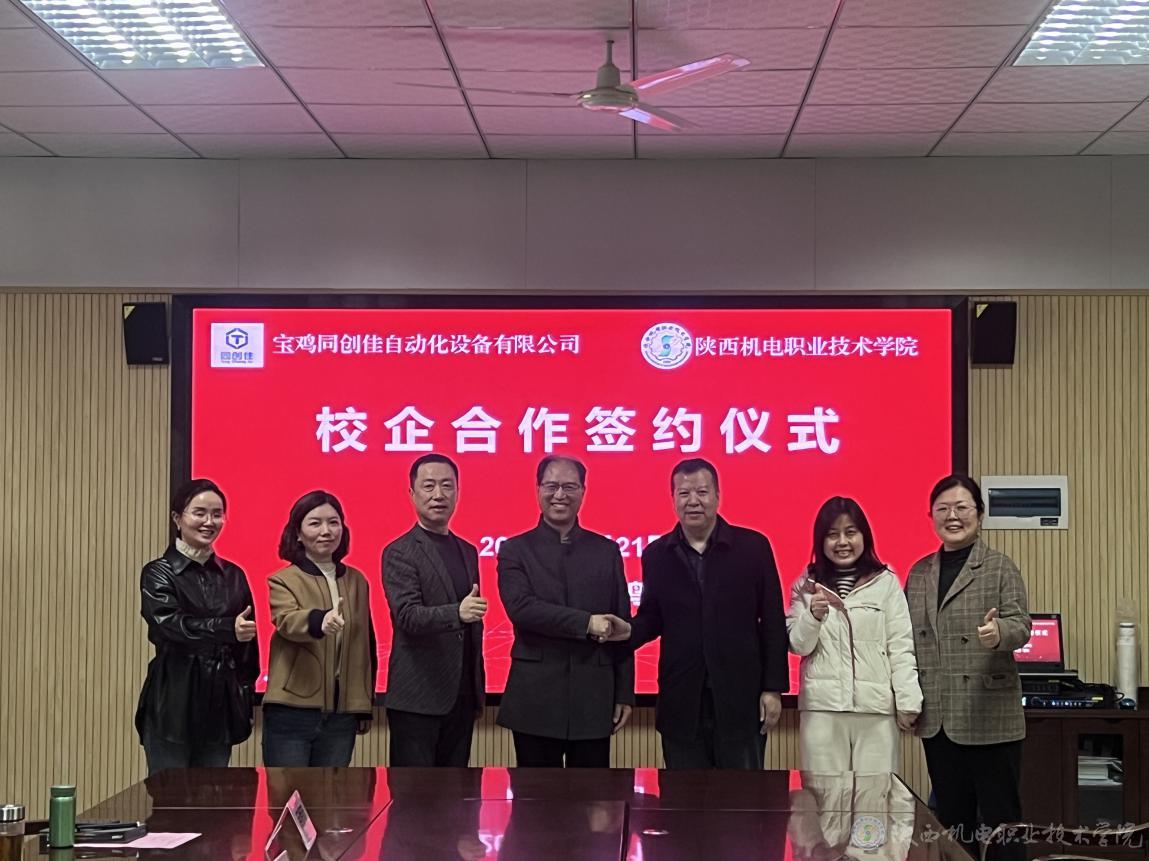 3月21日上午,陕西机电职业技术学院与宝鸡同创佳自动化设备有限公司校企合作签约仪式在学院图书馆二楼会议室隆重举行。宝鸡同创佳自动化设备有限公司总经理刘朝龙、行政经理吕艳妮,陕西机电职业技术学院党委书记伊逊智,党委委员、副院长张克出席签约仪式。会议由校企合作处处长白娟娟主持。