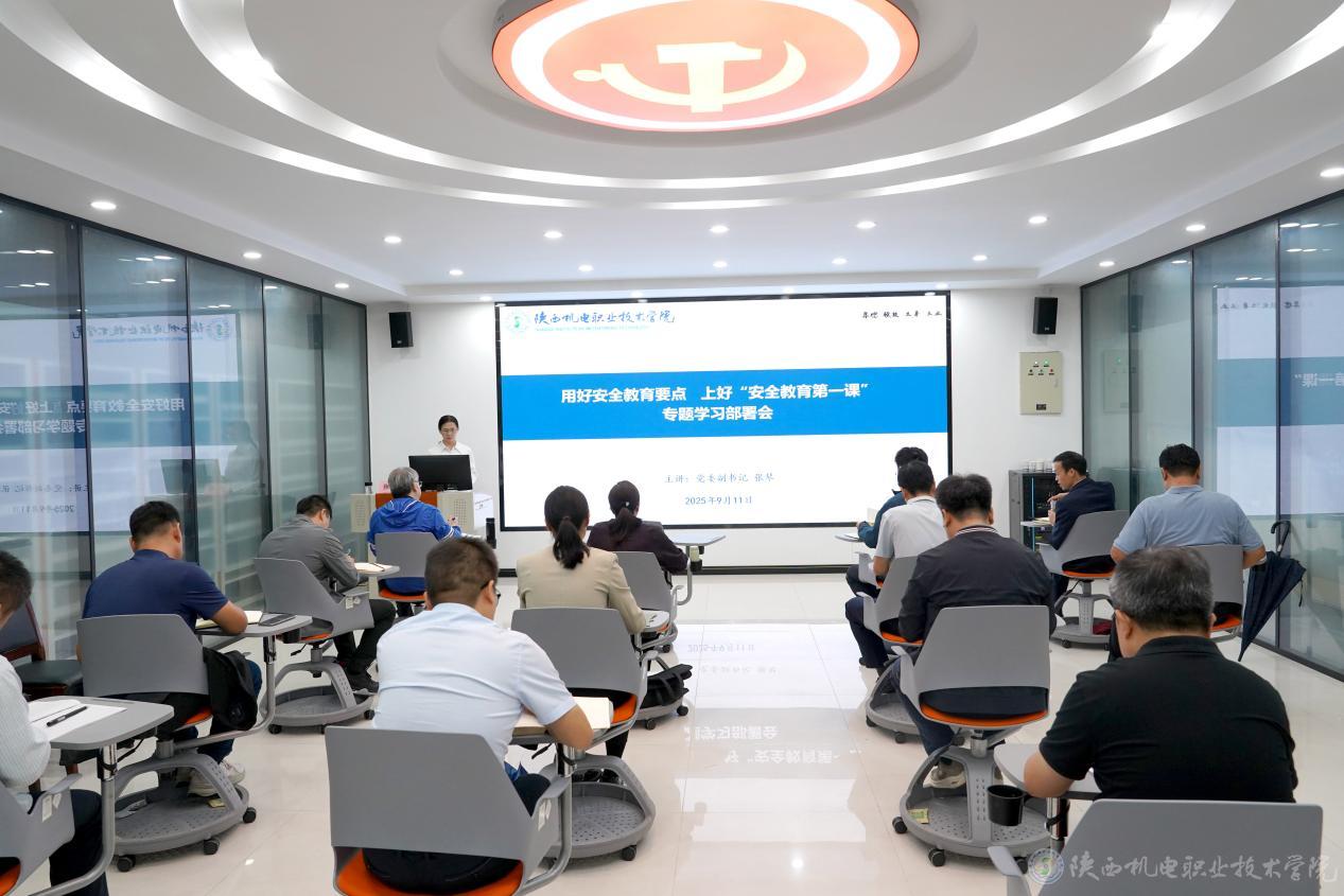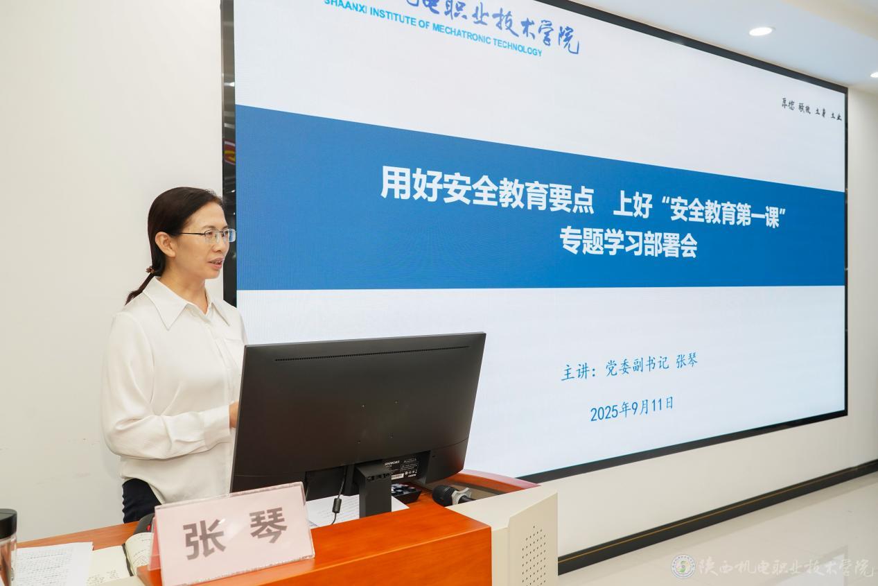在开学之际,为进一步提高安全教育的针对性和可操作性,用好高校安全教育要点(2025年),深入贯彻落实省委教育工委文件要求,9月11日上午,陕西机电职业技术学院在蟠龙校区大思政教育中心会议室召开专题学习部署会。党委副书记张琴给全校相关部门上“安全教育第一课”。